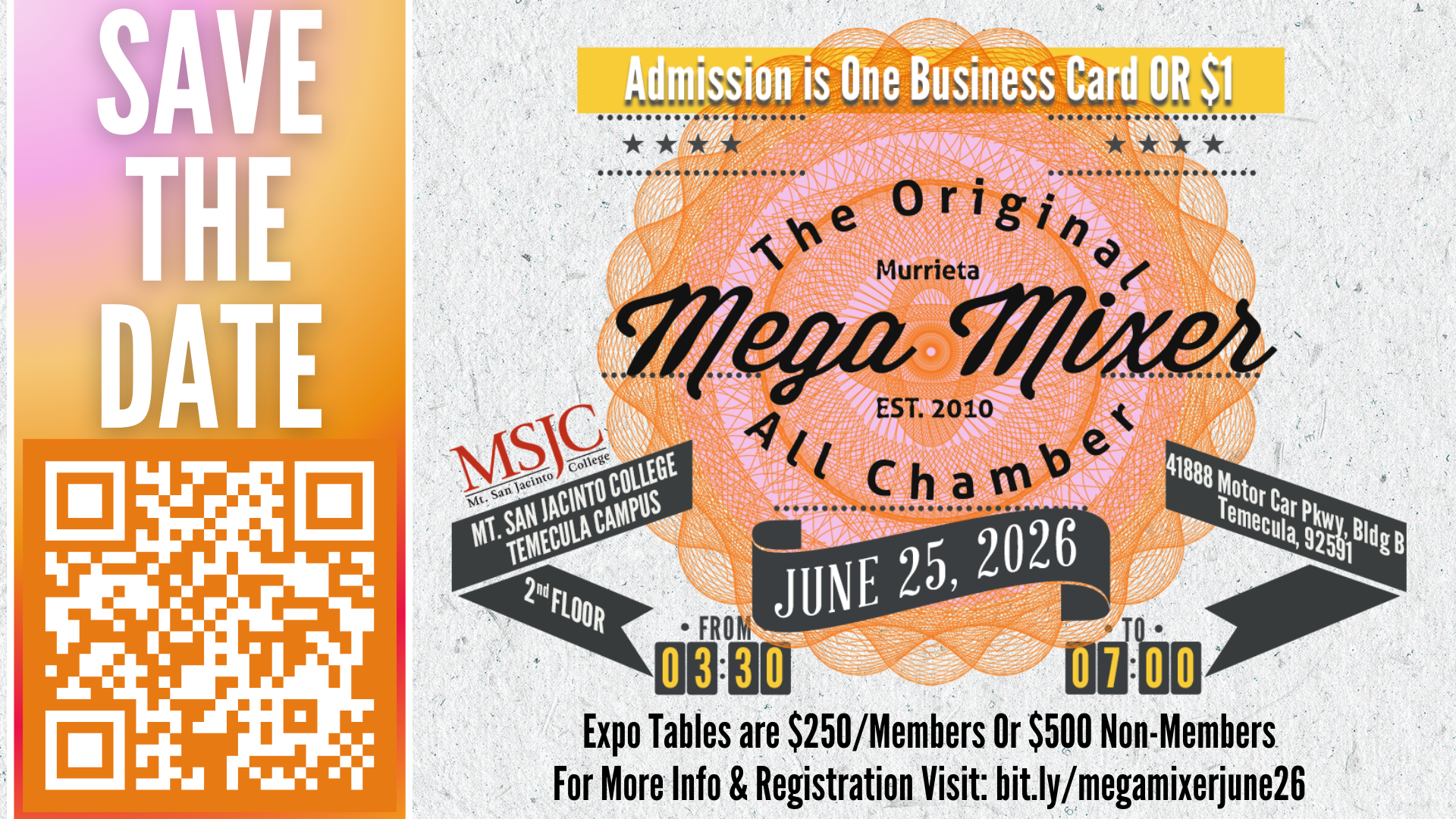 Admission is just one business card or $1, no registration to attend.Expo tables are: $250 for Chamber Members or $500 Non-MembersSponsorship Opportunities are available for MEGA Mixer!