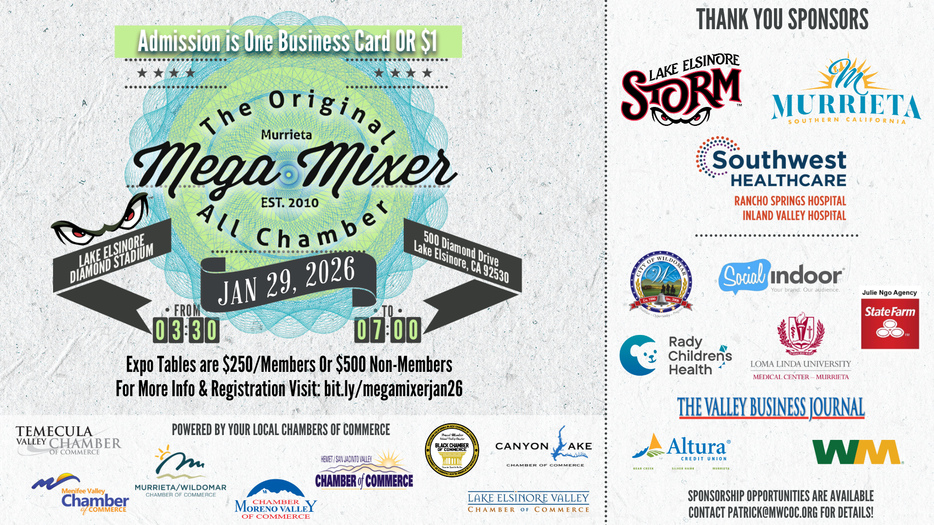 Admission is just one business card or $1, no registration to attend.Expo tables are: $250 for Chamber Members or $500 Non-MembersSponsorship Opportunities are available for MEGA Mixer!