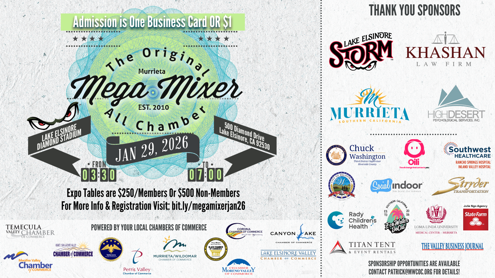 The All Chamber MEGA Mixer is a Networking Extravaganza powered by local chambers in our region working together to connect our business communities! This year, we’re excited to be back at a fan-favorite location—the Lake Elsinore Diamond Stadium! This exciting venue offers an unparalleled opportunity to engage with fellow professionals, fostering relationships, collaborations, and potential partnerships within our vibrant business landscape.