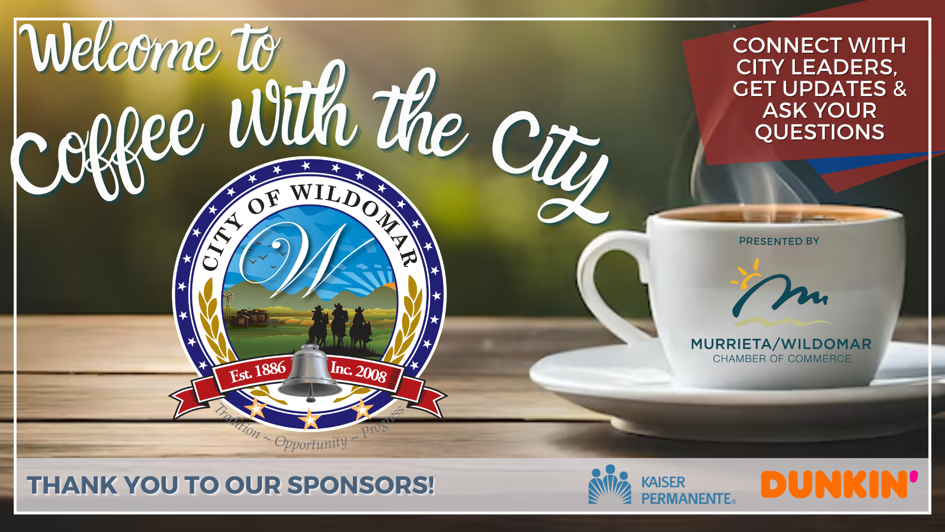 Are you looking to connect with your local community and engage with city leaders? We invite you to join us for "Coffee with the City of Wildomar", a monthly event designed to bring residents, business owners, and city officials together in a relaxed and informal setting.