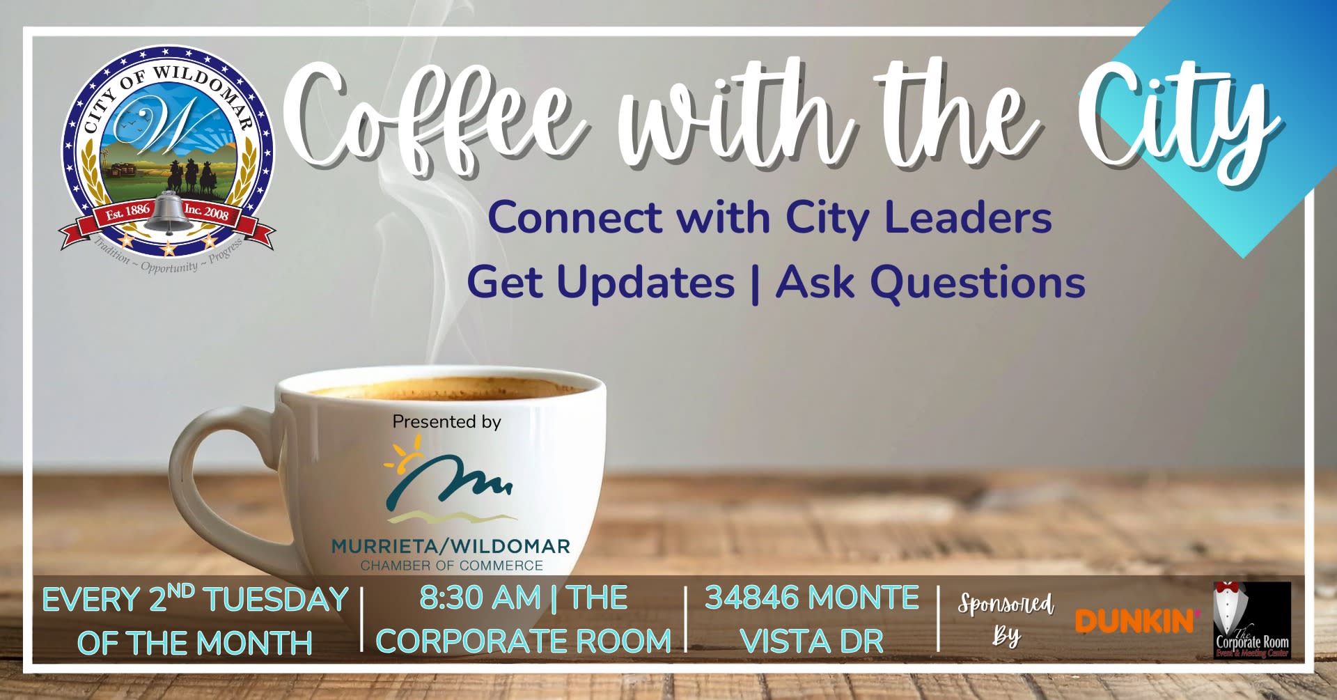 - Enjoy a cup of coffee while engaging in meaningful discussions with the Mayor, City Council members, and other city officials. This is your chance to ask questions, share your thoughts, and learn more about what's happening in Wildomar.
