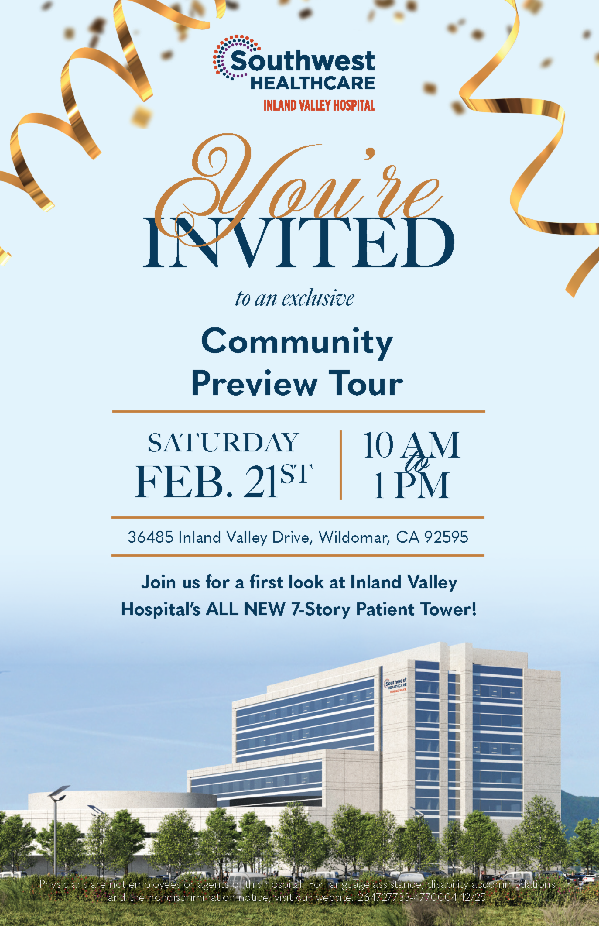 Southwest Healthcare is proud to celebrate the completion and Grand Opening of the Inland Valley Hospital's ALL NEW 7-story Patient Tower! Please join us for a first look at the expansion, with an exclusive Community Preview Tour on February 21st - we look forward to seeing you there!