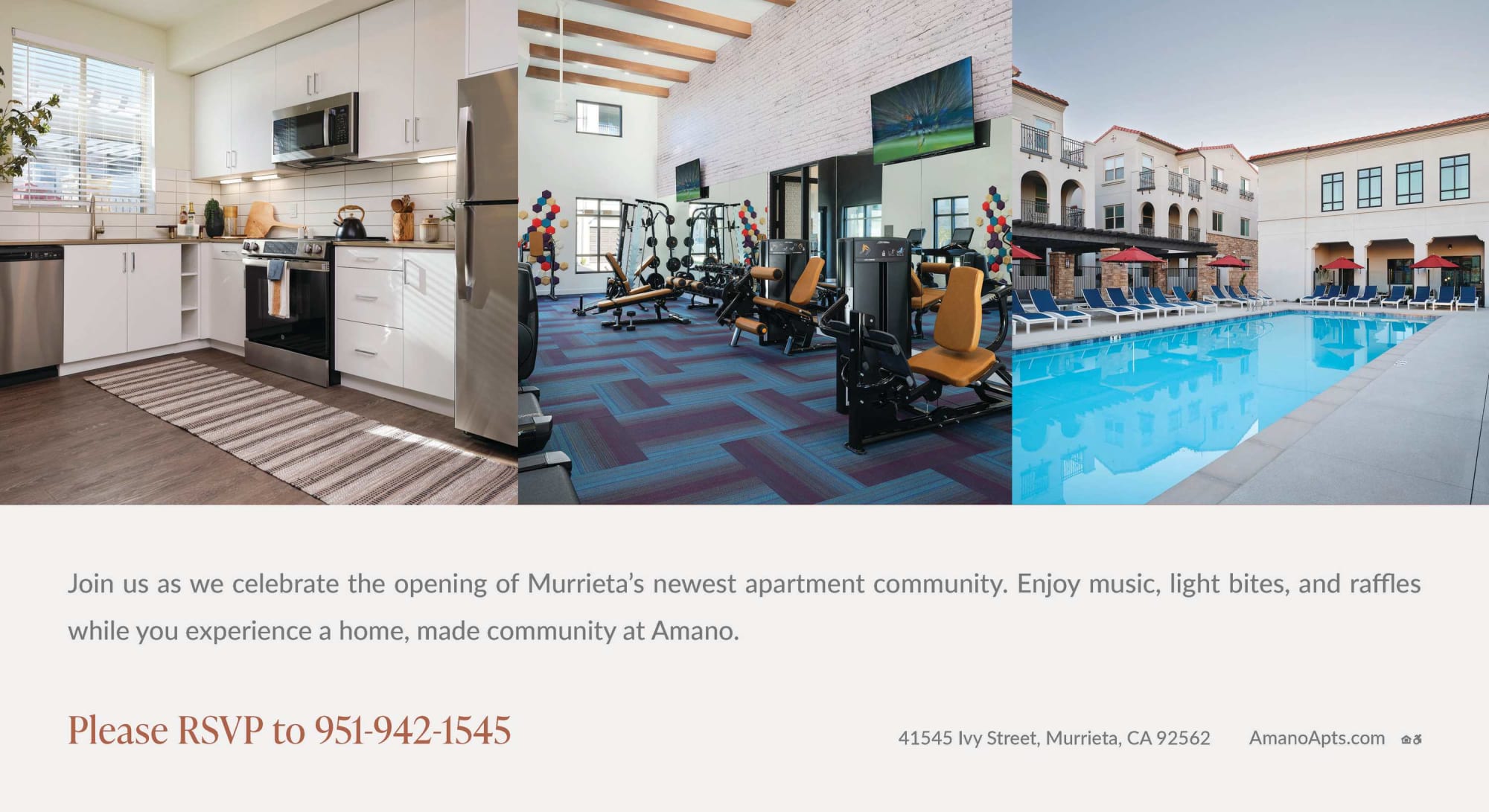 Celebrate the Grand Opening of the Amano Apartments, Murrieta’s newest modern living community designed with comfort, convenience, and elevated lifestyle in mind. Featuring contemporary interiors, resort-style amenities, and thoughtfully curated shared spaces, Amano Apartments brings a fresh residential experience to the heart of Murrieta.🌿🏘️