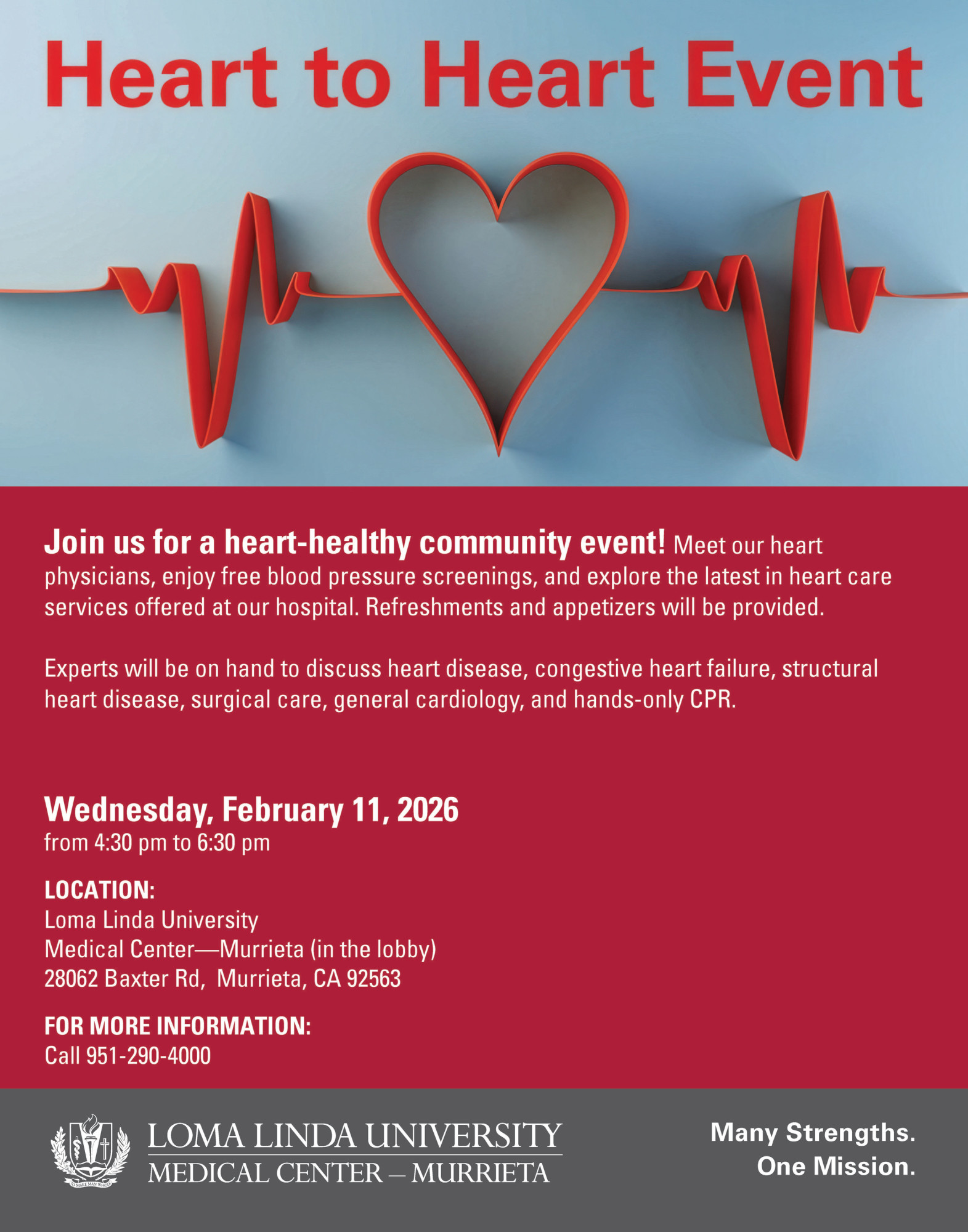Join us for a heart-healthy community event! Meet our heart physicians, enjoy free blood pressure screenings, and explore the latest in heart care services offered at our hospital. Refreshments and appetizers will be provided. Experts will be on hand to discuss heart disease, congestive heart failure, surgical care, general cardiology, and hands-only CPR.