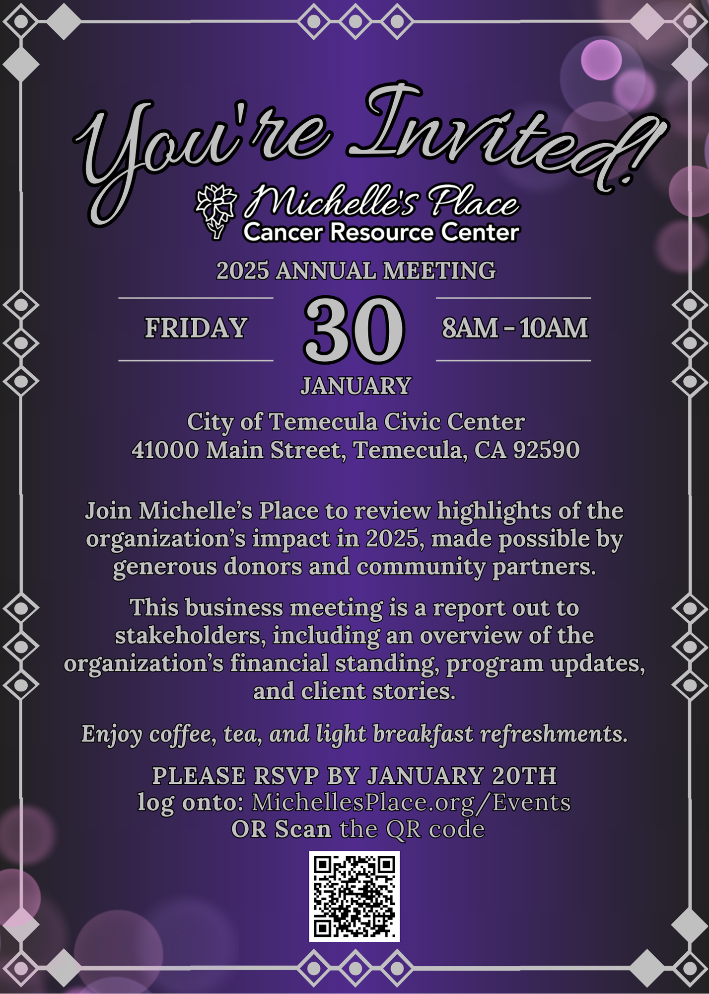 Join us as we review highlights of Michelle’s Place’s impact in 2025, made possible by the generosity of our donors and community partners. This business meeting will include an overview of the organization’s financial standing, program updates, and client stories.