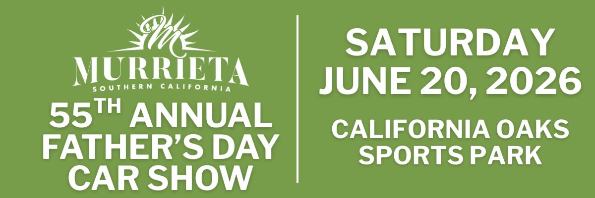 DESCRIPTION:Join the City of Murrieta for the 55th Annual Father's Day Car Show on Saturday\, June 20\, 2026 from 2-8 PM at California Oaks Sports Park! Enjoy a full day of classic cars\, family fun\, vendors\, awards\, and live music! Click here for vendor opportunities!Click here to register your car!