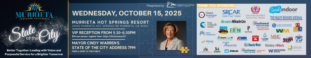 Presented by the Murrieta/Wildomar Chamber of Commerce in partnership with the City of Murrieta, the annual State of the City highlights key accomplishments, city updates, and what’s ahead for Murrieta. Mayor Cindy Warren will deliver this year’s address, sharing the city’s vision and priorities for the future.