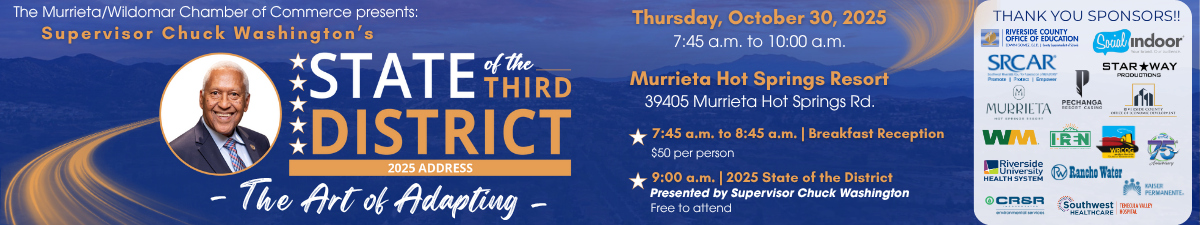 Presented by the Murrieta/Wildomar Chamber of Commerce, the annual State of the District highlights key accomplishments, updates, and what's ahead for Riverside County's Third District. Supervisor Chuck Washington will deliver this year's address, sharing the district's vision, priorities, and opportunities for the future.The State of the District address is free and open to the public. Prior to the address, a ticketed Breakfast will be available for $50 per person - offering a meaningful opportunity for business leaders, elected officials, and community members to connect before the program begins.